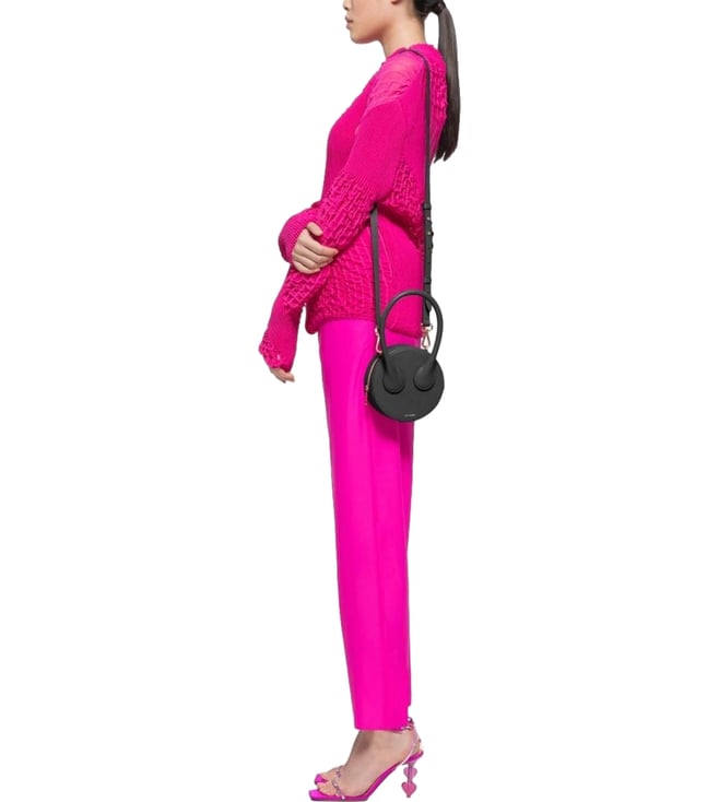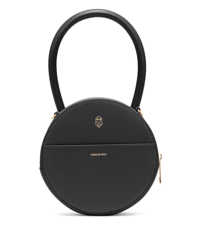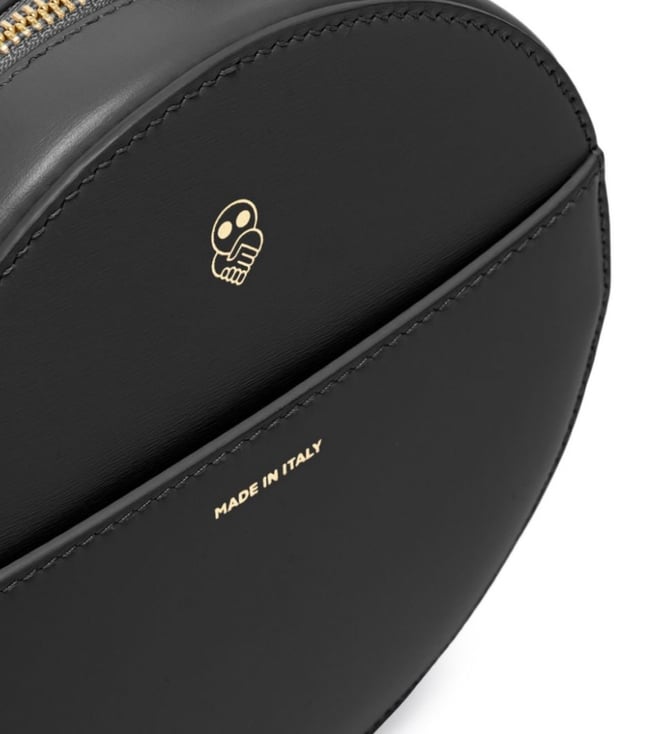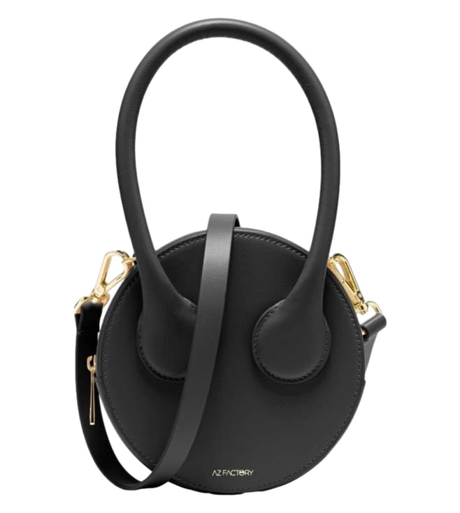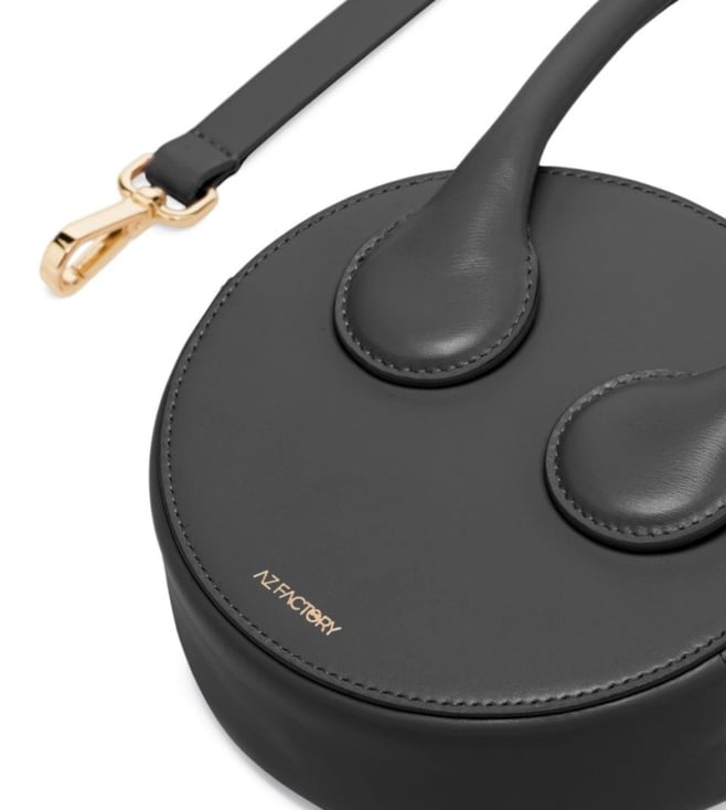 X ester manas round cake tote bag from AZ Factory featuring black, leather, logo stamp to the front, smooth grain, circular body, single circular top handle, top zip fastening, main compartment and detachable shoulder strap.