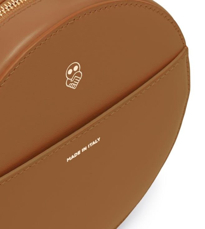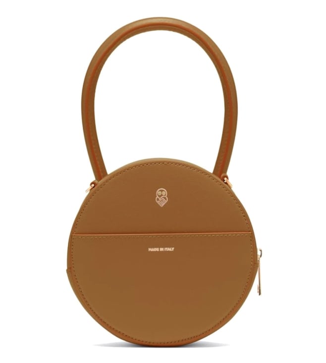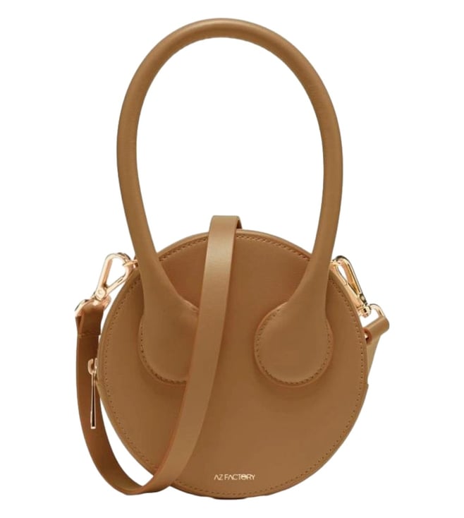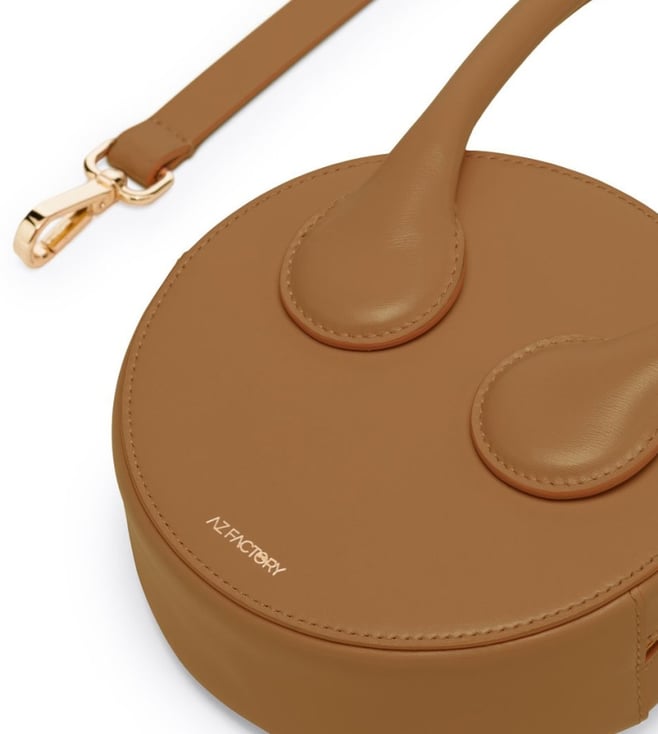 X ester manas round cake tote bag from AZ Factory featuring camel brown, leather, logo stamp to the front, smooth grain, circular body, single circular top handle, top zip fastening, main compartment and detachable shoulder strap.