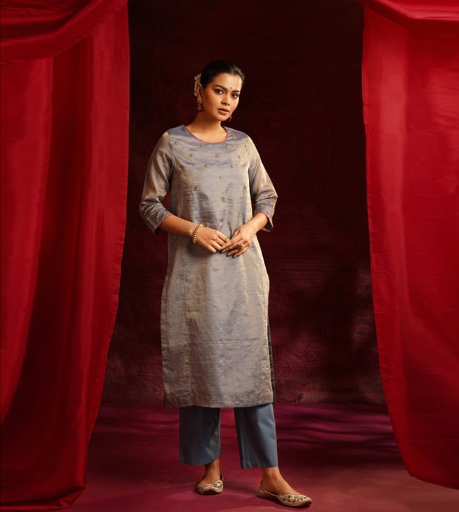 Persian Blue Block Printed Chanderi Kurta With Pant And Dupatta