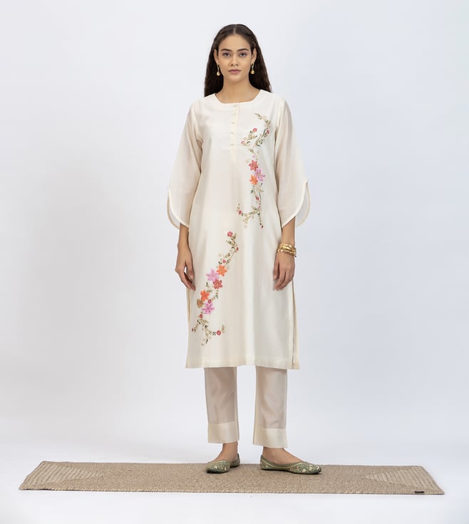 Cream Floral Embroidered High-Low Kurta with Pants Set