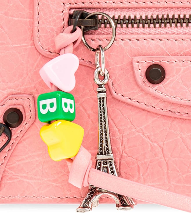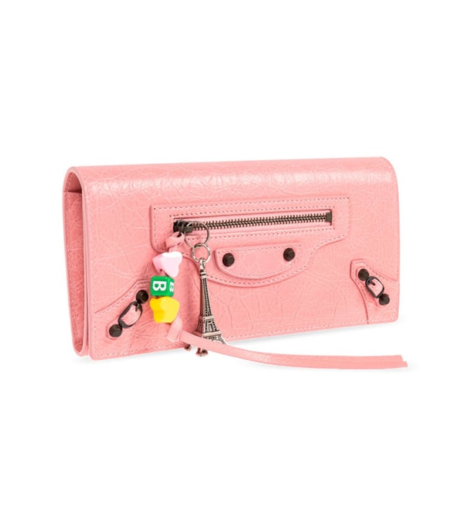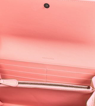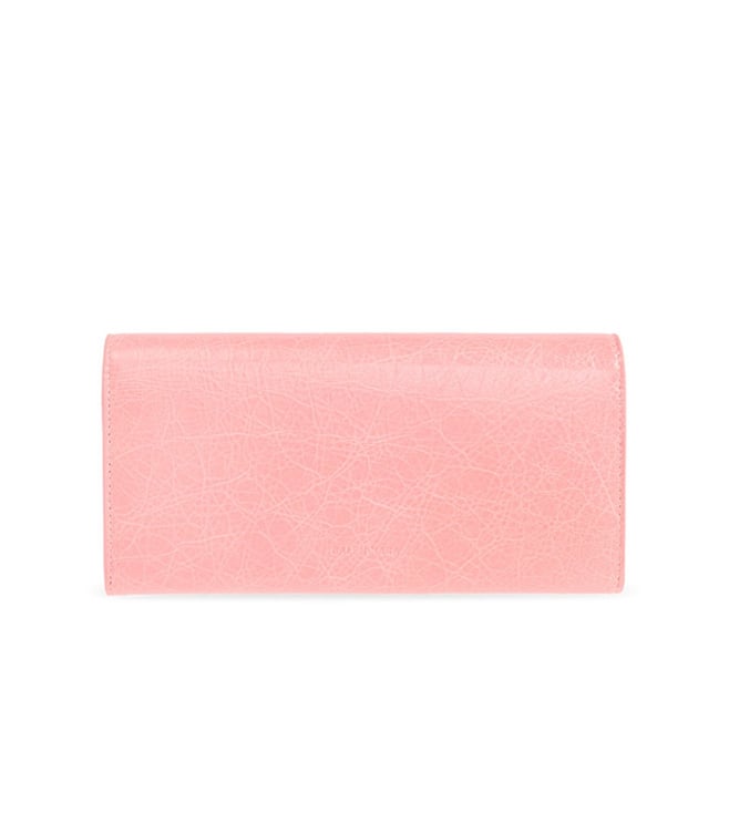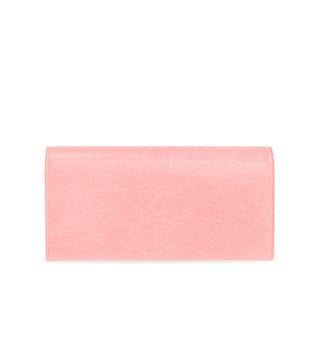 Leather in crinkle finish. flap-over closure with snap-button fastening front zip fastening pocket six card slots two bill slots one slip pocket signature stud hardware logo charm embellishment. 100% leather. w 20 x h 11 cm
