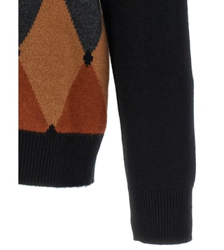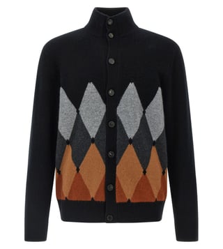 Wool cardigan with argyle pattern on the front, high neck, button closure, long cuffed sleeves, true to size fit.