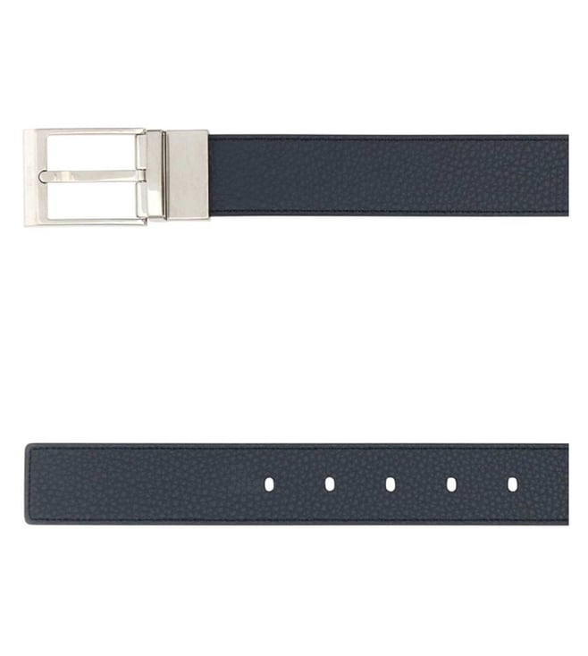 Elevate your style with the Bally casual belt in Textured navy blue. Crafted from premium leather, this versatile belt offers two looks in one with its reversible design. The pebbled texture adds a touch of sophistication, while the engraved logo and silver-tone buckle provide a sleek finish. With punched holes for a customizable fit, this belt is perfect for the modern man looking to effortlessly elevate his wardrobe. Make a statement with this must-have accessory that seamlessly transitions from casual to formal occasions.