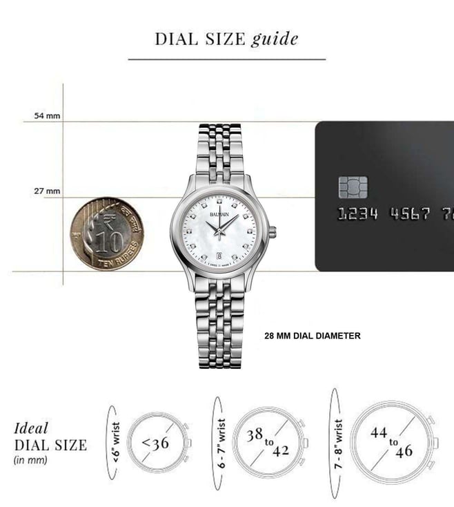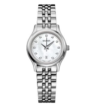 Define your suave personality by wearing this women's watch from the Beleganza Lady II collection by Balmain. Secured by a sapphire glass, the round dial is housed in a 27.5 mm case. It exhibits plain three hands and a crown for time adjustment. The strap is crafted with care using stainless steel 316L that gives a good finish.