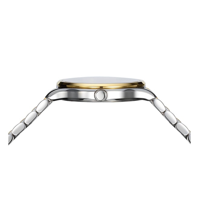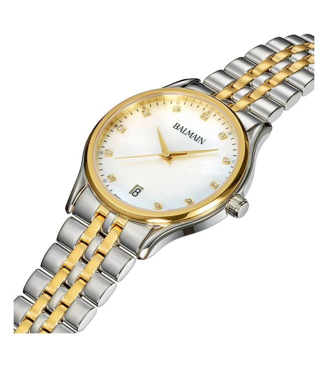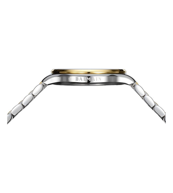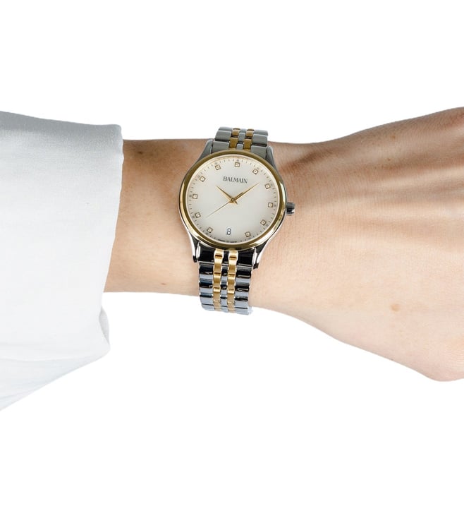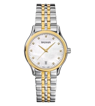 Add a classy touch to your attire by wearing this women analog watch from Balmain. The white round 32 mm dial is protected by a sapphire glass. The stainless steel strap comes in a silver and gold hue that further elevates the look of the timekeeper. Moreover, it is fitted with a clasp that ensures a secure fit on the wrist.