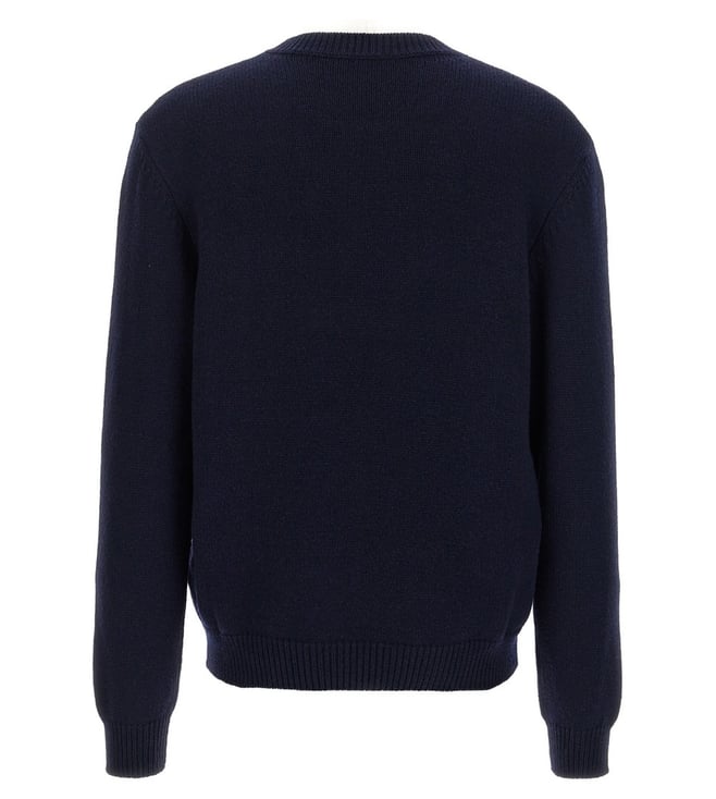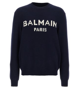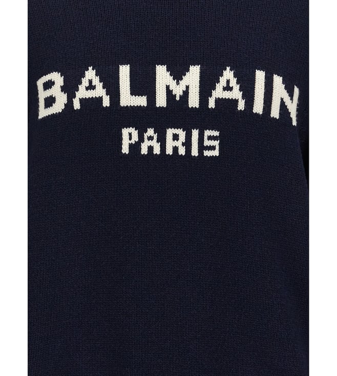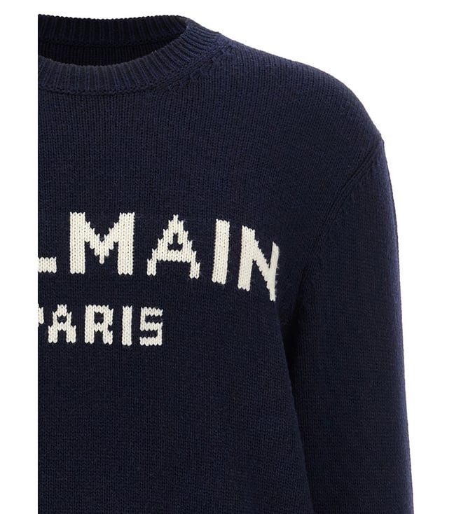 Elevate your style with the Balmain Navy Typography Relaxed Fit Sweater. Wool blend sweater with contrasting intarsia effect logo on the front, crew neck, long cuffed sleeves. Comfort fit. Products purchased from Darveys are supported exclusively by the warranty/exchange policies of Darveys and its partner boutiques. Brand owners and their channel partners are not responsible for exchange/warranty services for items purchased through Darveys.
