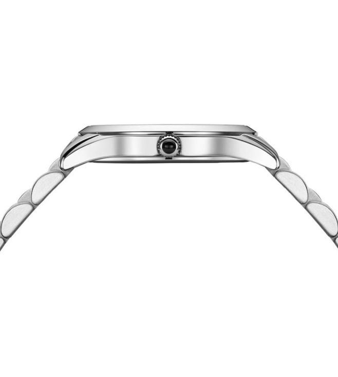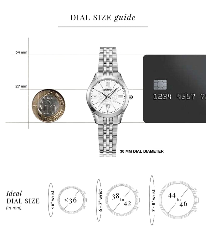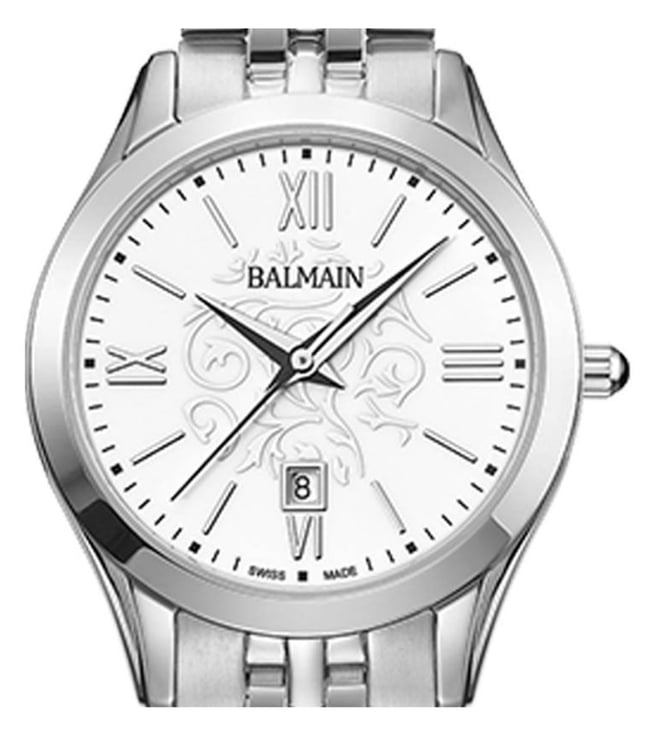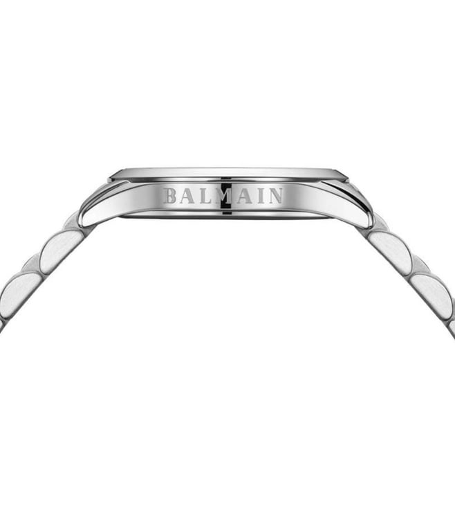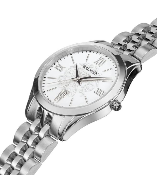 Add a classy touch to your attire by wearing this women's analog watch from Balmain. The white round dial is protected by a sapphire glass. It has a crown for time adjustment. The stainless steel strap comes in a silver hue that further elevates the look of the timekeeper. Besides, it is completed with a butterfly with pushers clasp to ensure a secure fit on the wrist.