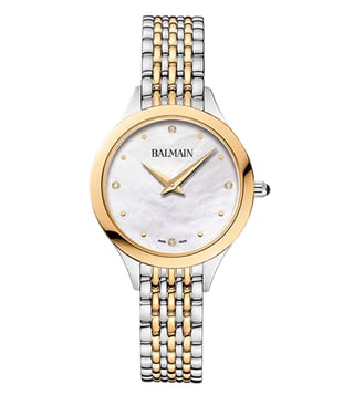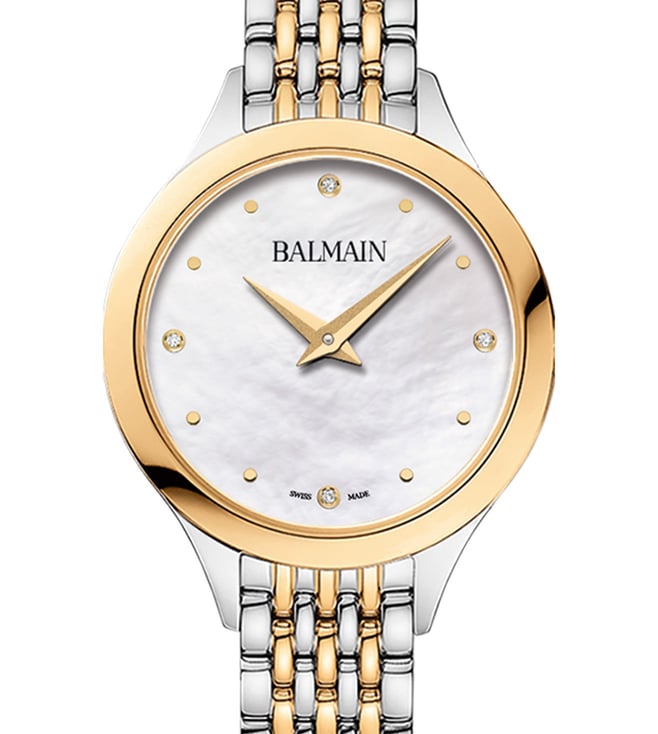 Introducing the Balmain B3912.39.85 Tradition Balmain de Balmain II Mini Swiss Made Analog Watch for Women. This elegant timepiece features 4 dazzling Top Wesselton diamonds, each 0.90-0.95 mm in size, with a total weight of 0.015 ct. The diamonds, with VS-SI clarity and single cut, accentuate the watch's refined design. Swiss craftsmanship meets timeless sophistication in this stunning mini watch.
