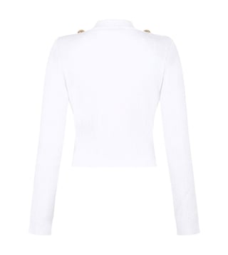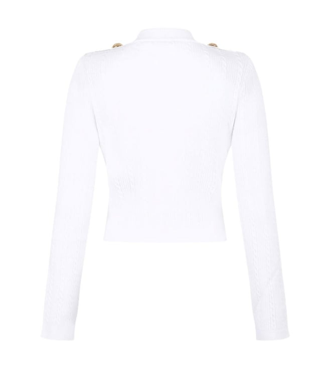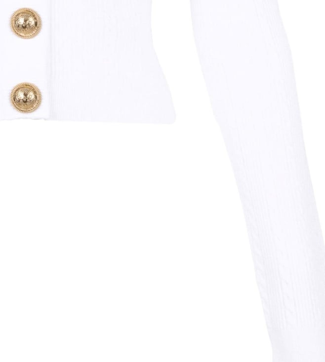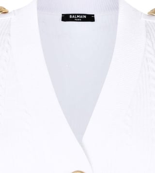 The Balmain White Ribbed Button Cardigan is a sophisticated blend of elegance and modernity, crafted for the discerning woman. Its pristine white hue is accentuated by a subtle ribbed pattern, exuding timeless charm. Made from a luxurious blend of 83% Viscose and 17% Polyester, it offers a soft, comfortable fit. The cardigan features a classic button closure, adding a touch of refinement. Perfect for any occasion, it seamlessly combines style and comfort, making it a must-have in any wardrobe.