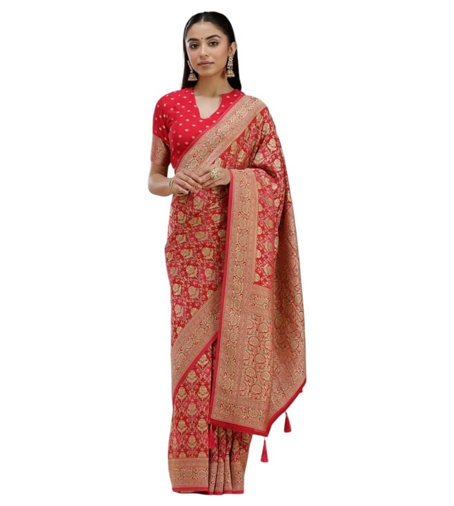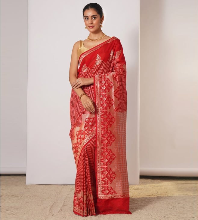 Soft Gold & Red Kashvi Banarasi Hand Embroidered Silk Tissue Lehenga and Blouse