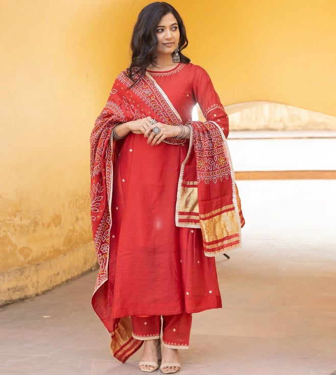 Red Kanak Chanderi Embroidered Three Kali Suit Set Kurta With Pant Bandhani Dupatta