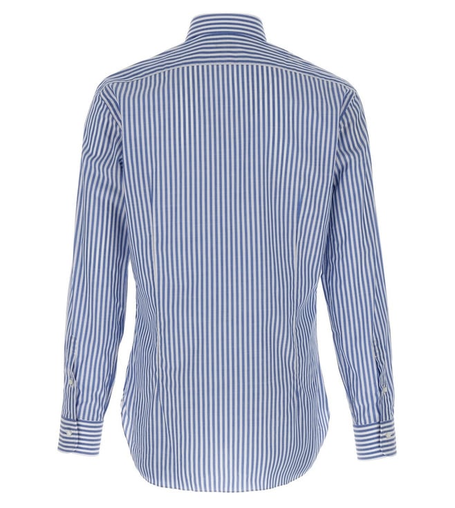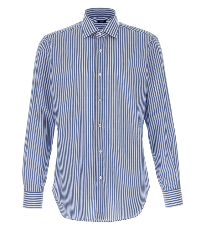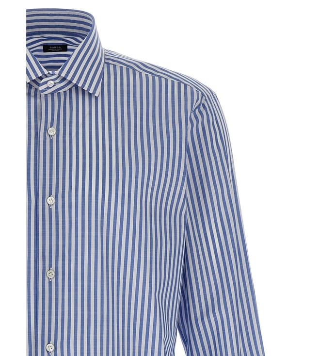 Elevate your style with the Barba Light Blue Striped Slim Fit shirt. Striped cotton shirt with front button closure, back pin tucks, long cuffed sleeves. Slim fit collar size. Products purchased from Darveys are supported exclusively by the warranty/exchange policies of Darveys and its partner boutiques. Brand owners and their channel partners are not responsible for exchange/warranty services for items purchased through Darveys.
