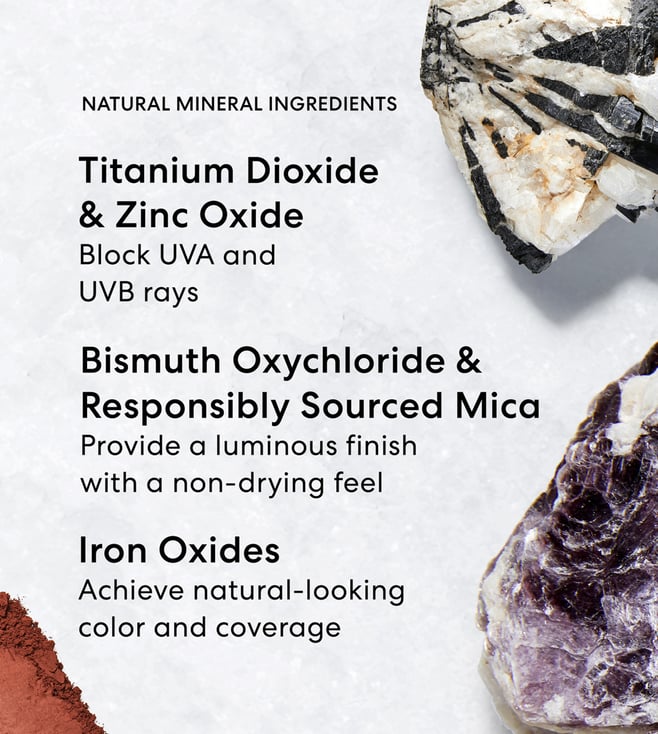 Titanium Dioxide & Zinc OxideProvide Mineral-Based Sunscreen Protection From Uva And Uvb RaysResponsibly Sourced Mica & Bismuth OxychlorideProvide A Luminous Finish With A Silky, Non-Drying FeelIron OxidesMineral-Based Pigments For Natural-Looking Color And Coverage Active Ingredients: Titanium Dioxide 25% Inactive Ingredients: Mica. May Contain: Titanium Dioxide, Iron Oxides, Bismuth Oxychloride.