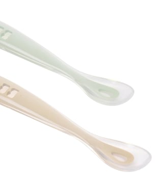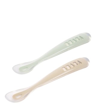 A set of two ergonomic silicone spoons designed for a baby's first stage of solid food. The ultra-soft tips protect delicate gums, while the shallow depth prevents babies from taking in too much food at once. Their long, rounded handle is comfortable for an adult to hold. Made from BPA-free silicone.