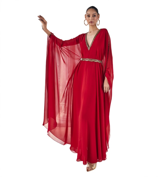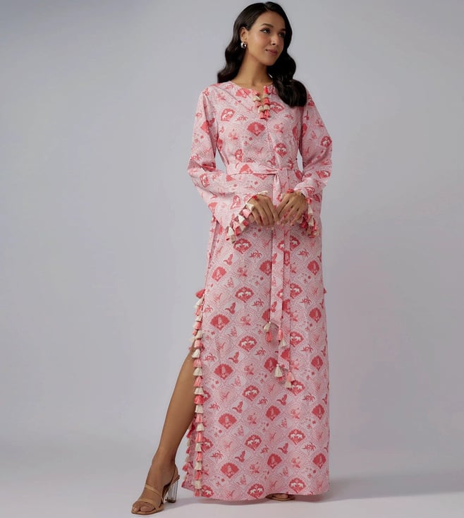 Blush Pink Printed Art Crepe Long Beyza Kaftan With Belt
