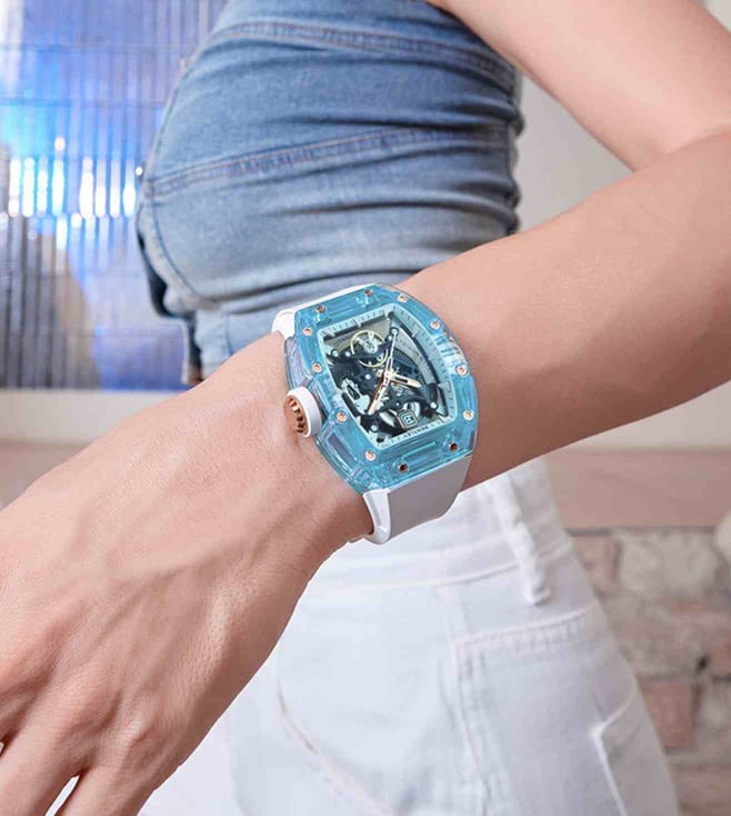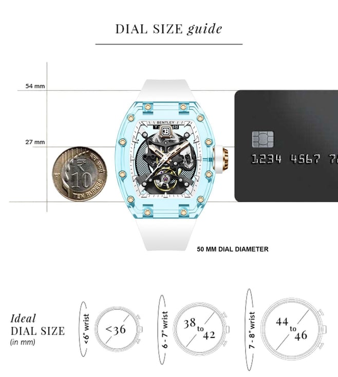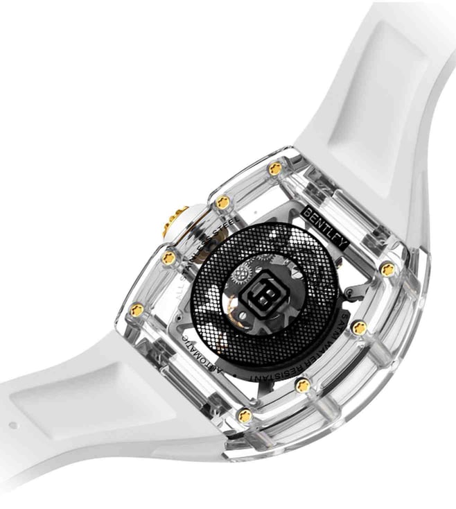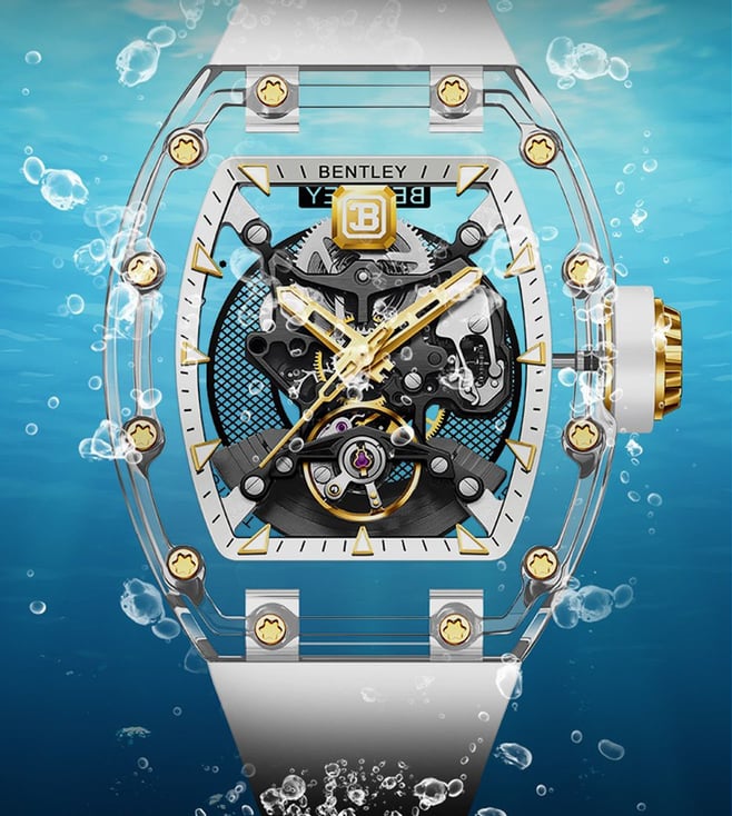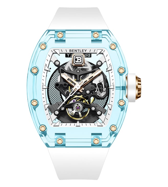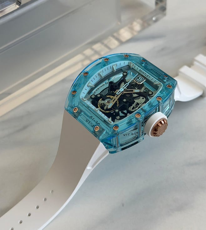 Presenting a masterpiece of horological craftsmanship, this Bentley timepiece is an epitome of refined elegance and modern innovation. Encased in a striking transparent aqua blue case, the watch radiates a refreshing vibrancy, perfectly complemented by gleaming golden screws that accentuate its sophisticated silhouette. At its heart lies the superior Automatic BX7885 Movement, delivering seamless precision and a self winding mechanism that honors the art of traditional watchmaking.