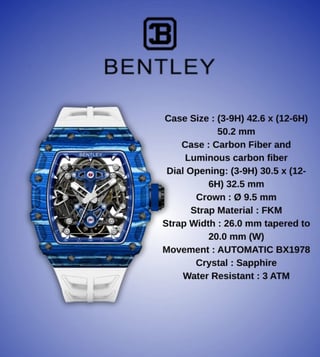 This magnificent Bentley timepiece stands as a true testament to haute horology, where art and engineering meet in perfect harmony. At its core lies the distinguished Automatic BX1978 Movement, delivering precision, reliability, and effortless sophistication with every tick. The case, masterfully crafted from cuttingedge carbon fibre, embodies both strength and featherlight elegance, making it as durable as it is luxurious. Its skeletonized dial unveils the enchanting ballet of gears and mechanics, a captivating window into the soul of watchmaking excellence.