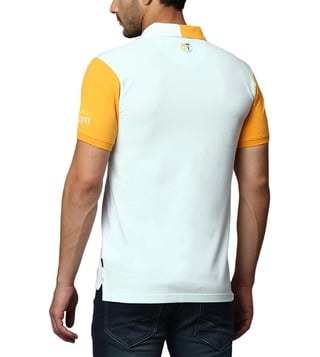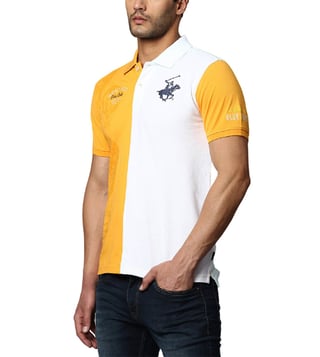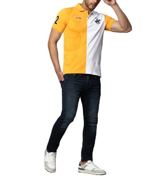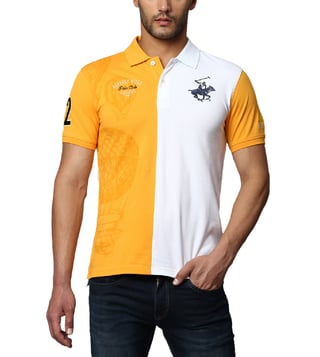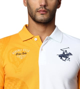 Give a beautiful upgrade to your off-work repertoire with delightful hues of this awesome orange & white polo t-shirt from the latest collection of Beverly Hills Polo Club. Lovingly crafted in premium cotton for a silky-soft feel, fine absorption and luxurious comfort, it's well-designed regular fit silhouette ensures a relaxed yet assured charm. Pair it with denims for a nifty look.