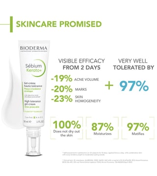 Sebium Kerato+ is a high tolerance anti-blemish gel-cream with visible results in 2 days. This gel benefits are anti-blemish, eliminates pimples and blackheads anti-marks, reduces existing marks and prevents the formation of new ones provides 8 hours hydration. It is also non-drying.