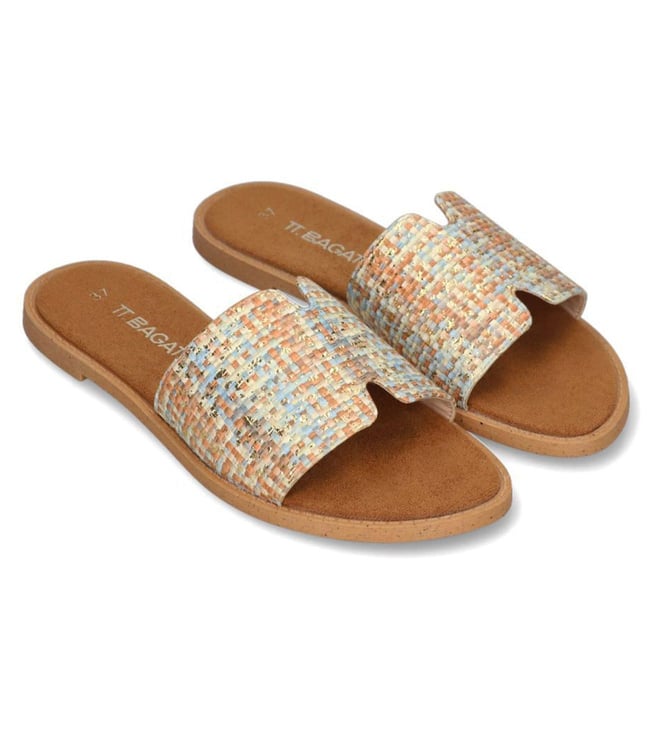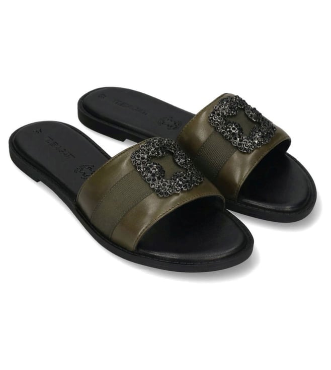 Multi Color Stone Black Leather Flat Sandals