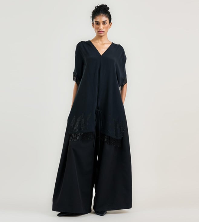 Modal Solid Black V-Neck Top With Navy Trousers Co-Ord Set