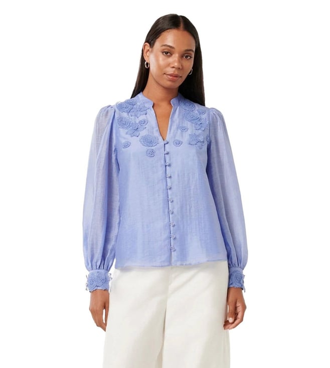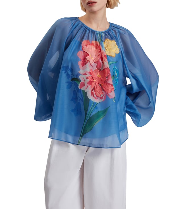 Blue Long Sleeves Alria Floral Graphic Organza Balloon Sleeve Blouse