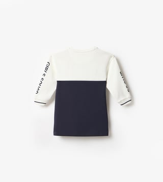 Unleash vibrant style with this multi-color, colorblocked T-shirt, designed for the fashion-forward girl. Its regular fit ensures comfort, while the long sleeves and round neck add a touch of classic elegance. Crafted from a premium blend of 70% cotton, 25% terry, and 5% spandex, this top offers a soft, breathable feel with just the right amount of stretch. Perfect for any occasion, this T-shirt effortlessly combines playful hues with a modern silhouette, making it a must-have in any wardrobe.