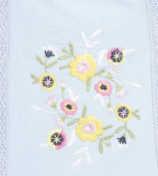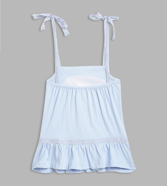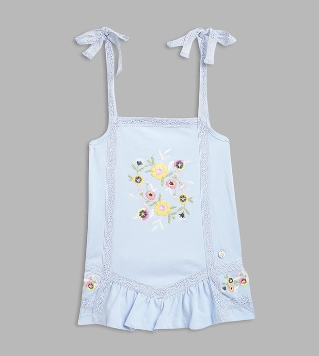 A breezy blue dream! This spaghetti strap top, crafted from pure cotton, features a playful embroidered pattern and a flattering flare fit. Tie-up closure adds a touch of whimsy, perfect for twirling and sunshine days.