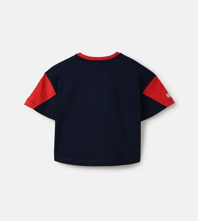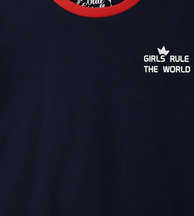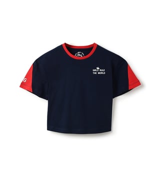 Discover the perfect blend of style and comfort with our blue typography pattern t-shirt for girls. This regular fit tee features a classic round neck and short sleeves, crafted from soft cotton fabric for all-day wearability. The pull-on closure ensures easy dressing, while the stretchable material offers flexibility and ease of movement. Designed with subtle branding and eye-catching contrast paneling detailing, this t-shirt adds a touch of flair to any outfit.