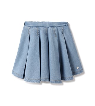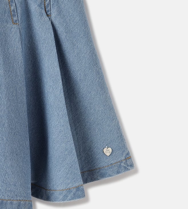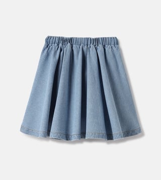 A classic and comfy choice for girls this washed denim flare skirt is perfect for everyday wear. Crafted from pure cotton it features a mid rise fit with an elastic closure for a comfortable and secure fit. The flared silhouette adds a touch of playful style while the solid blue color is versatile and easy to pair with any top.