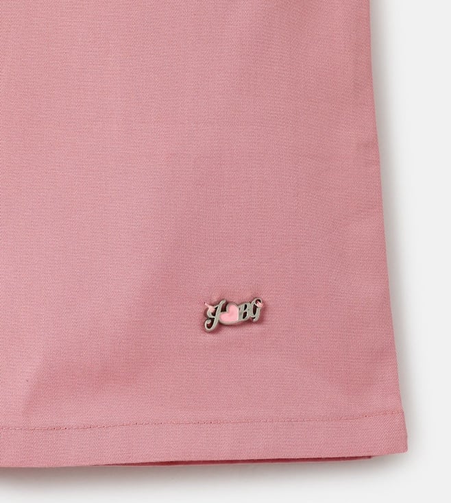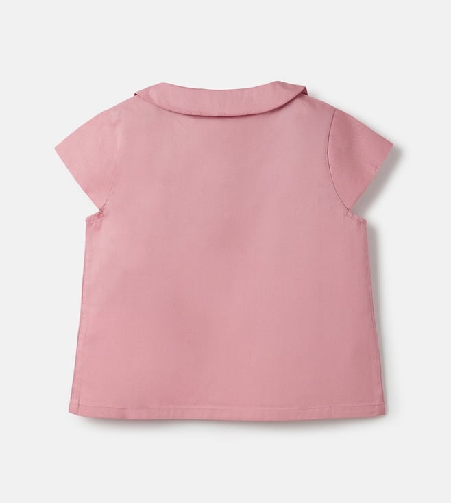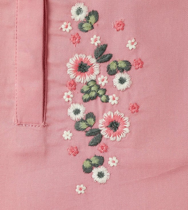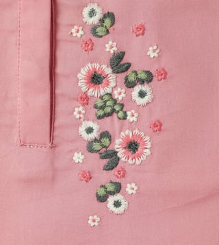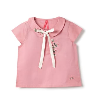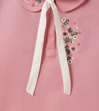 Introducing our charming pink top for girls, designed to bring a touch of elegance and playfulness to any wardrobe. This delightful piece features a regular fit adorned with vibrant embroidered floral patterns, adding a splash of color and whimsy. The cap sleeves offer a breezy feel, perfect for warm days, while the classic peter pan collar adds a timeless touch. Crafted from soft cotton fabric, this top ensures comfort throughout the day. The button-tie ups closure provides an adjustable fit and ease of wear.
