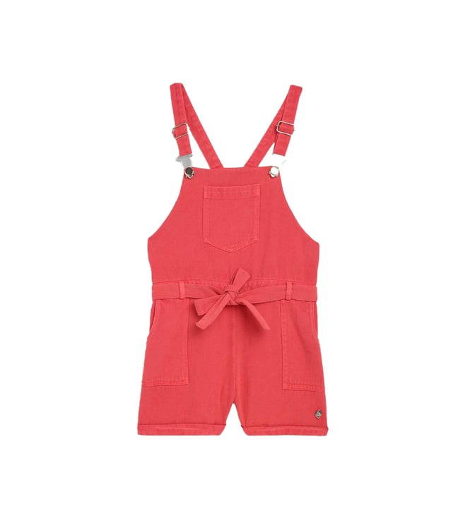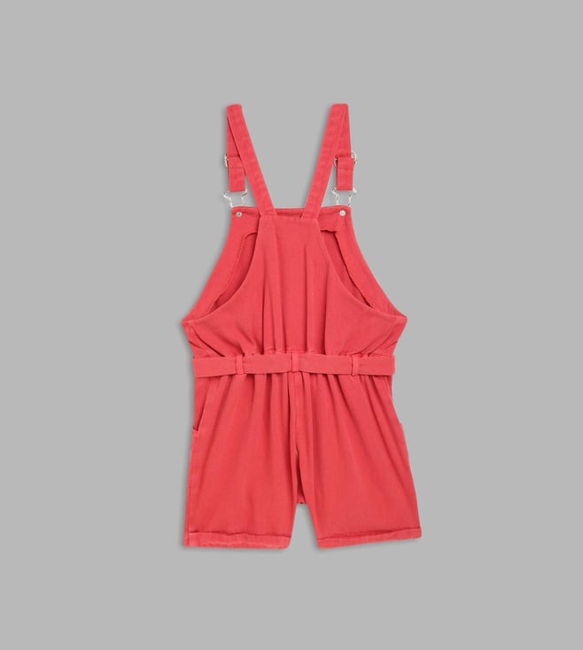 Introducing our vibrant red dungaree, designed for the spirited young girl who loves to make a statement. Crafted from pure cotton, this sleeveless piece ensures comfort and breathability all day long. The regular fit offers ease of movement, while the solid pattern adds a touch of classic charm. Featuring adjustable shoulder straps and a secure button closure, this dungaree is as practical as it is stylish. Perfect for playdates or casual outings, it's a must-have addition to her wardrobe.