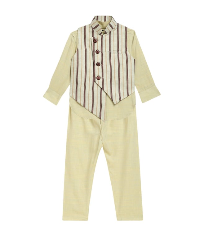 Dress your little one in style with a printed bandi set. Made with fine fabric, this three-piece kurta, pyjama and waistcoat ensures a comfortable fit for your active toddler. Comfortable and stylish, this set is a must-have for any youngster's wardrobe.