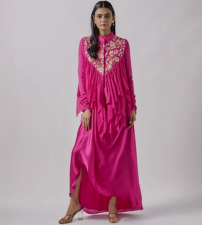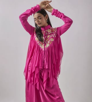 Embrace the fusion of style and comfort with this skirt set. It is curated to last for a long time using silk. It comes with thread embroidery. Accentuate with statement jewellery and heels. Disclaimer: Product colour may slightly vary due to photographic lighting sources. Country of Origin - India.