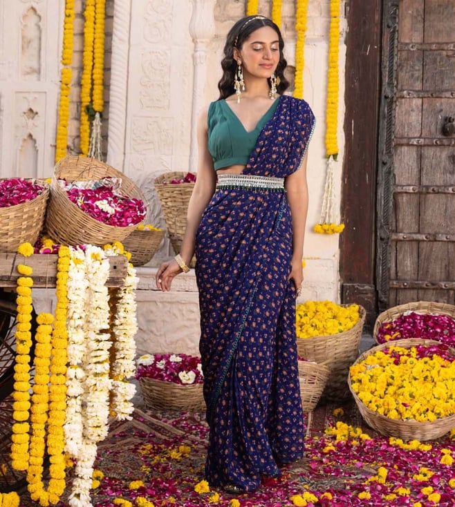 Royal Blue Crop Top with High Low Wide Palazzo Saree