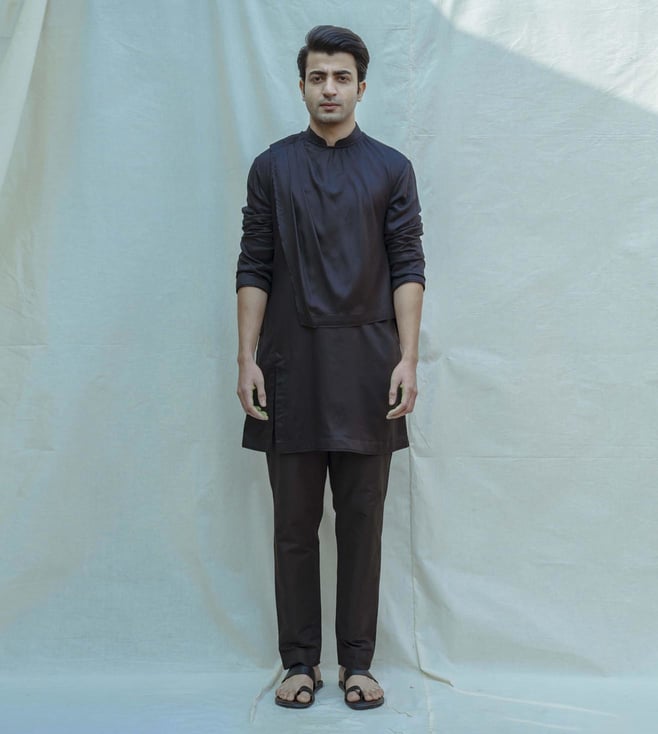 Black Satori Niruha Chikankari Open Achkan Jacket with Kurta and Pant