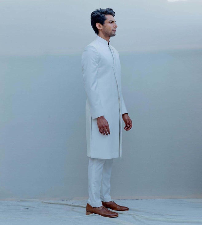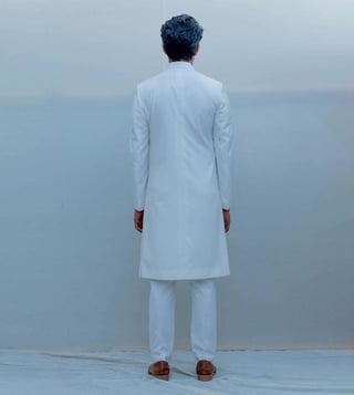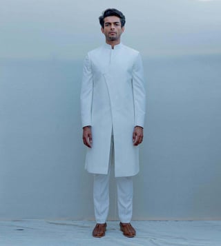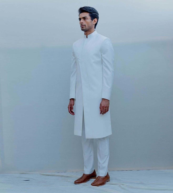 Declaim your minimalist mantras by wearing this milky white indo western jacket set from Bohame. Tailored to sartorial perfection from terry wool, it assures a soft and soothing touch against the skin. The band neck adds to its appeal. Exuding full sleeves, it is sure to fetch you compliments from all. Country of Origin - India. Disclaimer: Product colour may slightly vary due to photographic lighting sources.