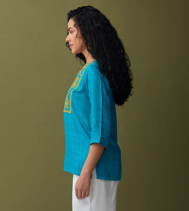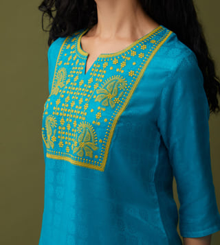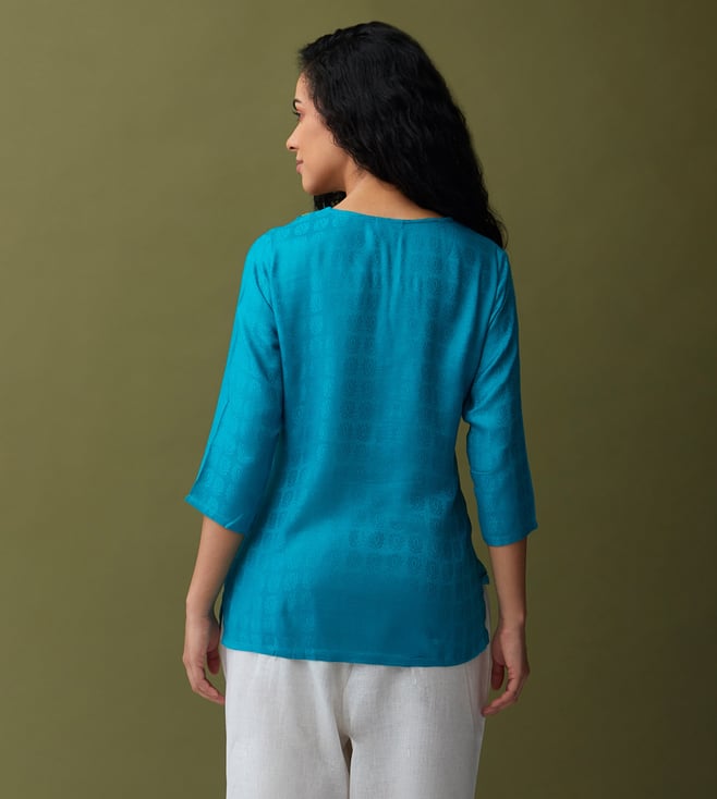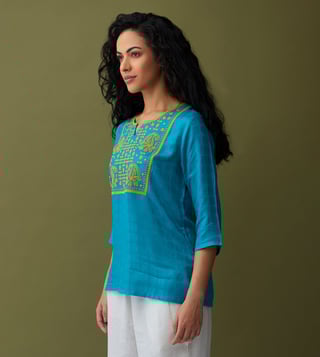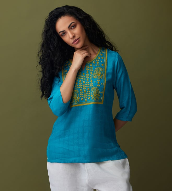 What makes this tunic truly unique is the meticulous print. Every swirl and pattern tells a story of craftsmanship, adding texture and depth to the fabric. It is made of viscose-jacquard. Disclaimer: All other items in the image are only for display purposes and will not be a part of the delivery content. Product colour may slightly vary due to photographic lighting sources. Country of Origin - India.
