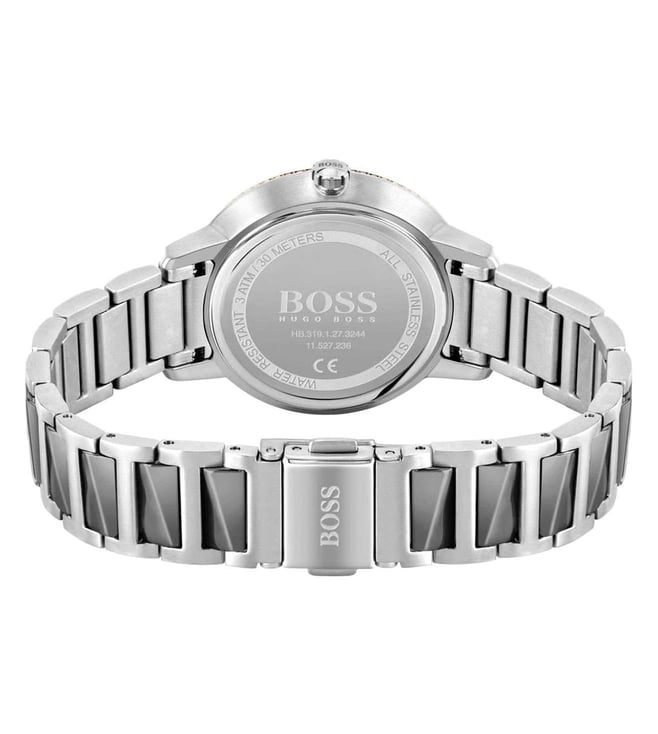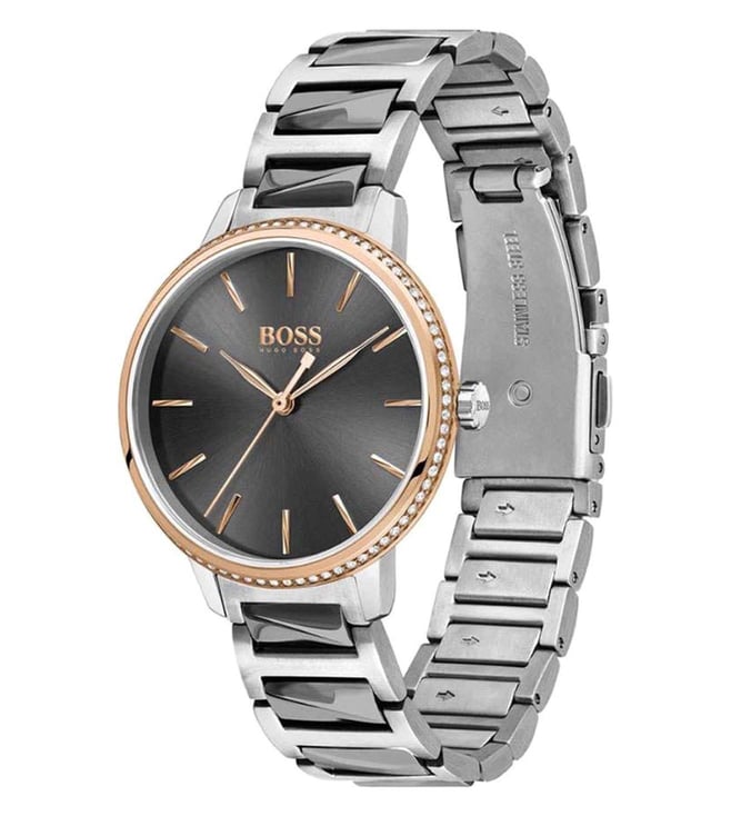 Give your wrist a classy look with this women's watch from the Signature collection by Boss. Encased in a 34 mm case, the grey round dial is protected by a mineral glass. It features plain three hands and a crown for time adjustment. The stainless steel strap showcases a silver hue that uplifts the look of the watch.