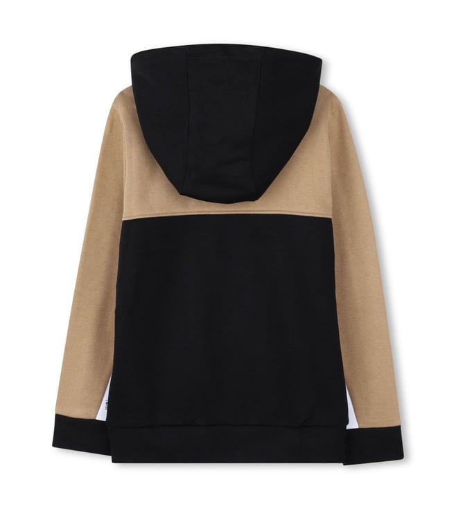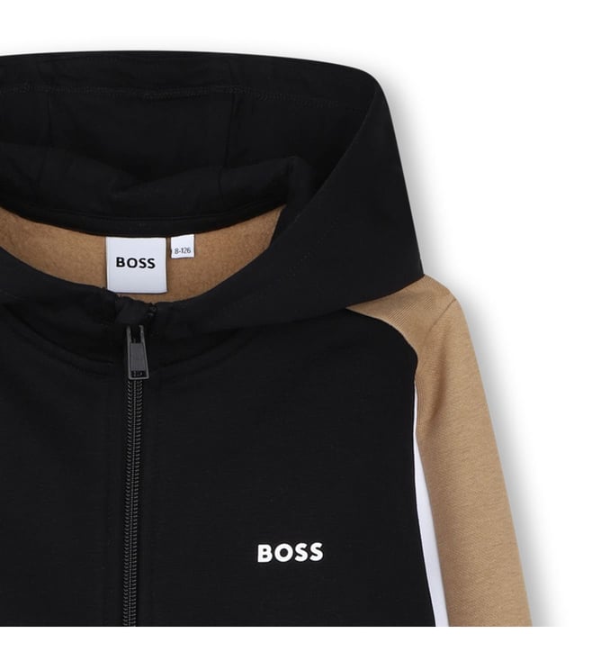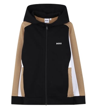 Stay warm and stylish with the Boss Black Hooded Cardigan. Made from soft brushed cotton polyester fleece, this hooded cardigan features a convenient front zip fastening for easy on and off. The iconic "BOSS" logo is printed on the chest, adding a touch of designer flair, while the woven logo label on the side showcases the brands attention to detail. Pair it with the matching trousers J52290 for a complete and polished look. Upgrade your wardrobe with this versatile and comfortable cardigan that effortlessly combines fashion and function.