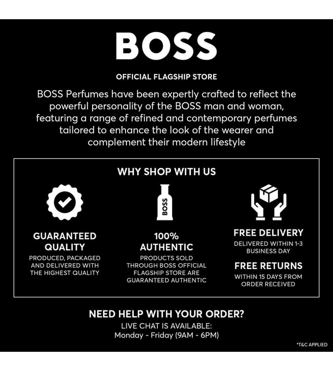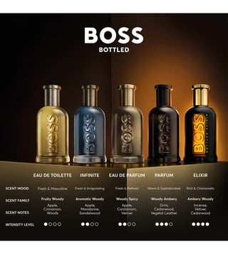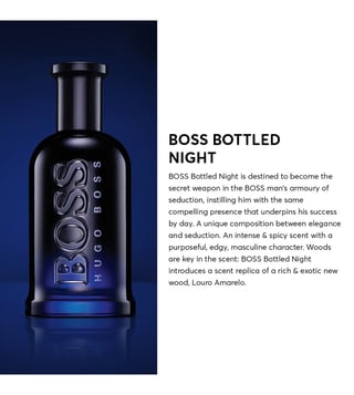 The BOSS Bottled Night eau de toilette is destined to become the secret weapon in the BOSS man's armoury of seduction, instilling him with the same compelling presence that underpins his success by day. It is a unique composition between elegance and seduction, the intense and spicy scent transmits a purposeful, edgy and masculine character.