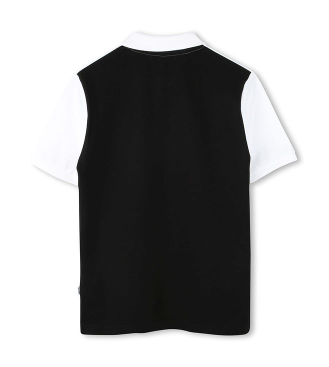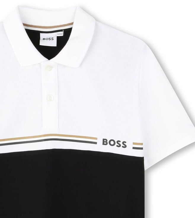 Elevate your child's style with the BOSS Kids Black And White Color Block Polo T-Shirt. This trendy and versatile piece effortlessly combines classic black and white hues with a modern color block design, making it perfect for any occasion. Crafted from high-quality materials, this polo T-shirt ensures both comfort and durability, allowing your little one to play and explore with ease. The iconic BOSS logo adds a touch of sophistication, making this shirt a must-have for fashion-forward kids. Upgrade their wardrobe today with this stylish and timeless piece.