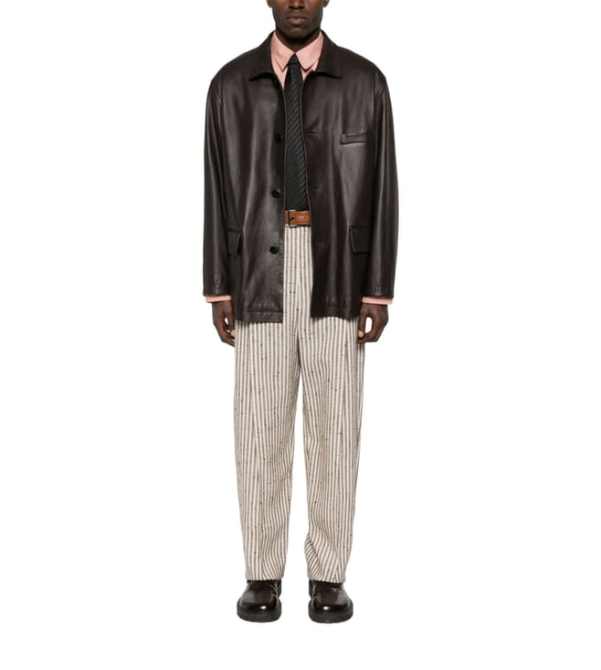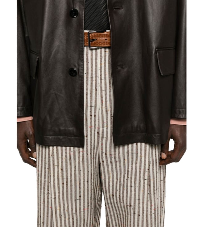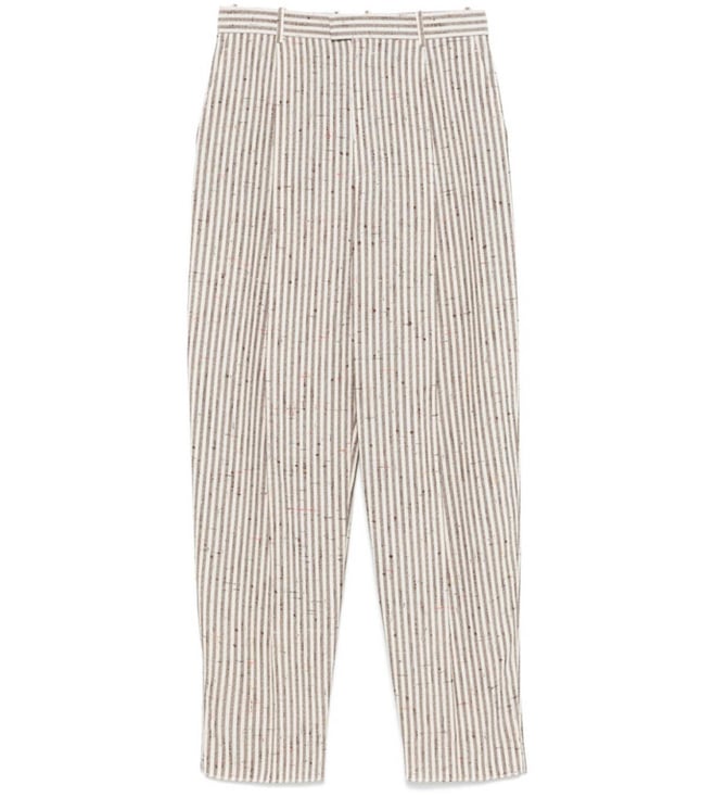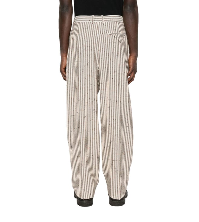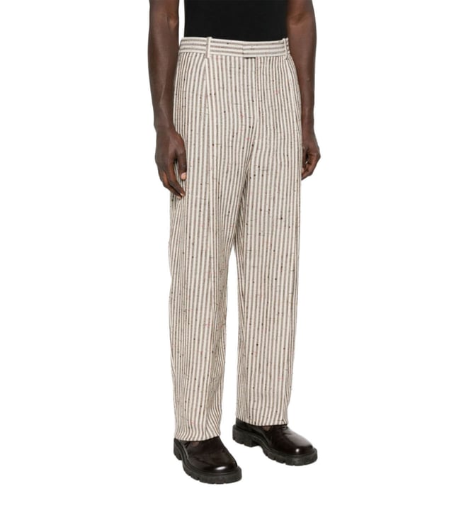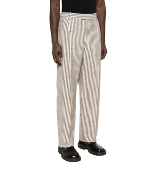 Elevate your style with the Bottega Veneta Beige Striped Relaxed Fit trousers. Light beige concealed front button, hook and zip fastening belt loops Crafted for durability and comfort. Products purchased from Darveys are supported exclusively by the warranty/exchange policies of Darveys and its partner boutiques. Brand owners and their channel partners are not responsible for exchange/warranty services for items purchased through Darveys.