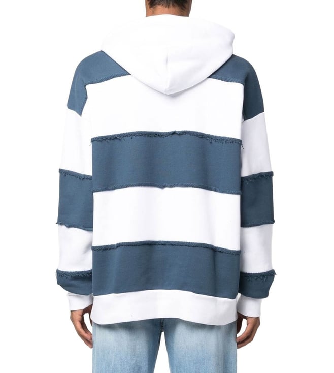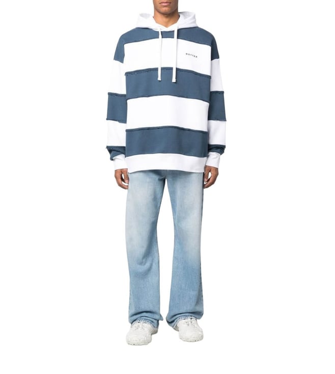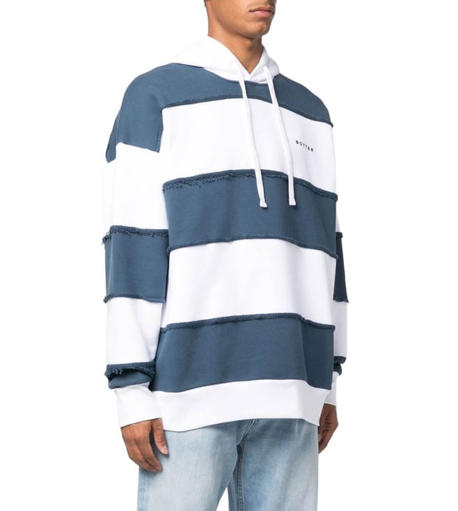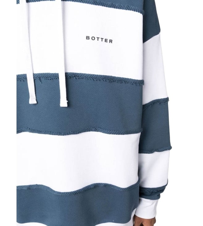 Elevate your style with the Botter White Striped Regular Fit Hoodie. Logoprint striped hoodie from botter featuring cotton, jersey knit, horizontal stripe pattern, rawcut finish, logo print at the chest, slouchy drawstring hood, long sleeves, straight hem and white/navy. This piece fits true to size. recommend you get your regular size model is 1,84m / 6ft 1in wearing size m.