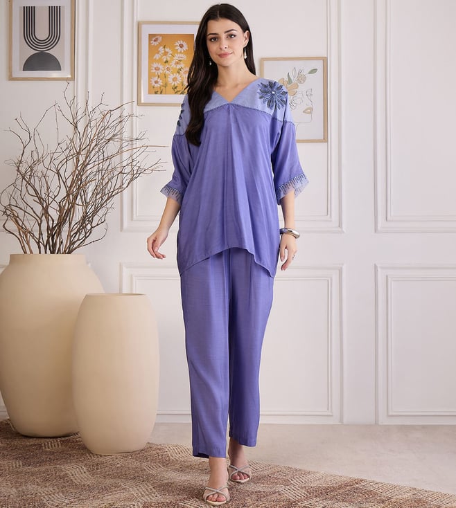 Slate Blue Floral Embroidered Kaftan Top with Pants