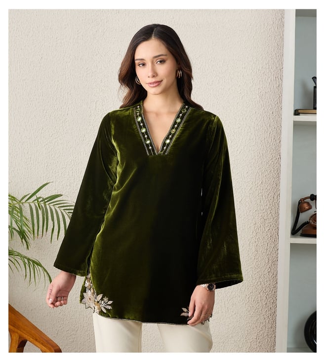 Olive Green Floral Cutwork Velvet Kurta