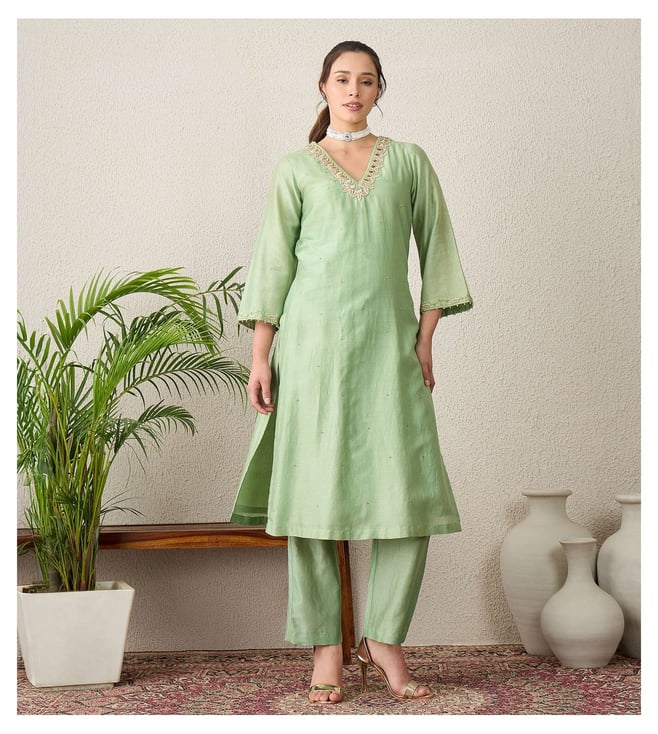 Pistacchio Green Yoke Embroidered Kurta with Pants Set