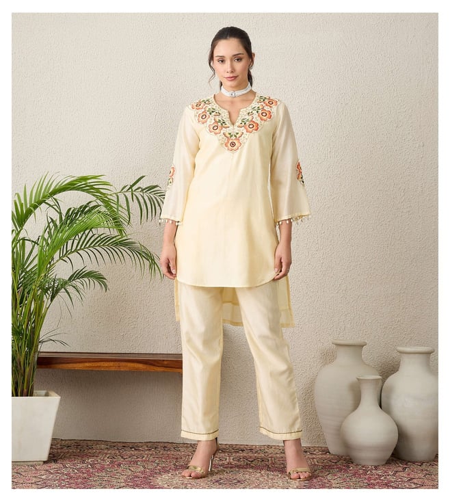 Cream Floral Embroidered High-Low Kurta with Pants Set