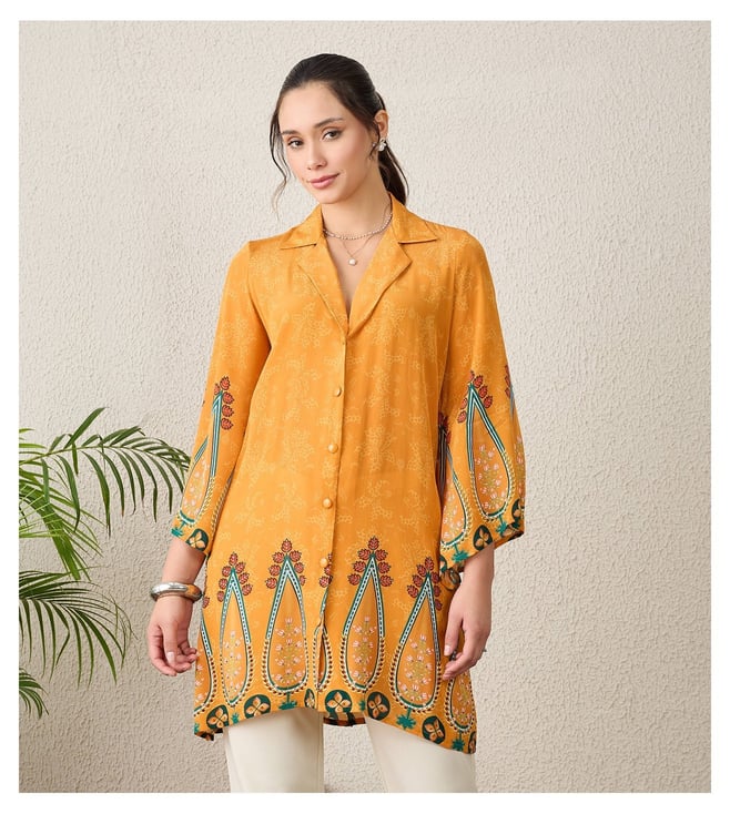 Orange Paisley Printed Crystal Embellished Shirt