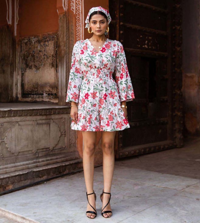 White Ilahi Summer Printed Cotton Mini Dress